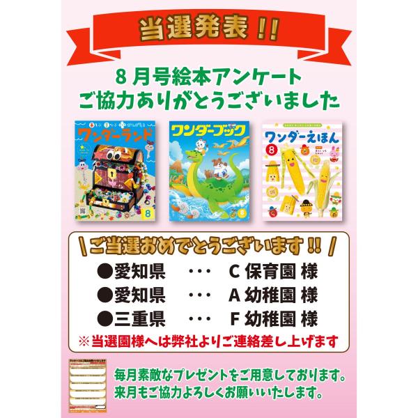 8月号絵本アンケートにご協力いただきました園様、誠にありがとうございました。